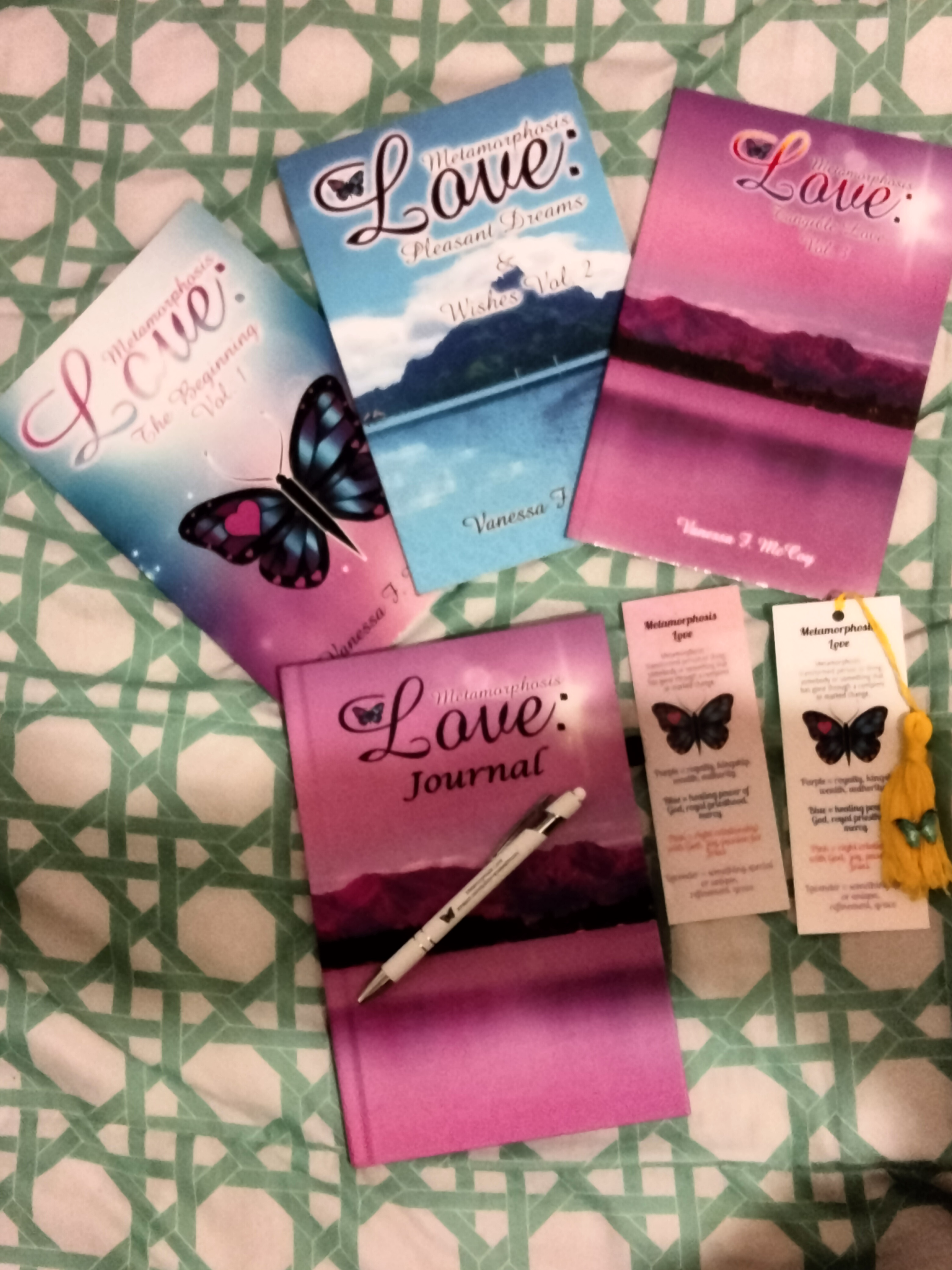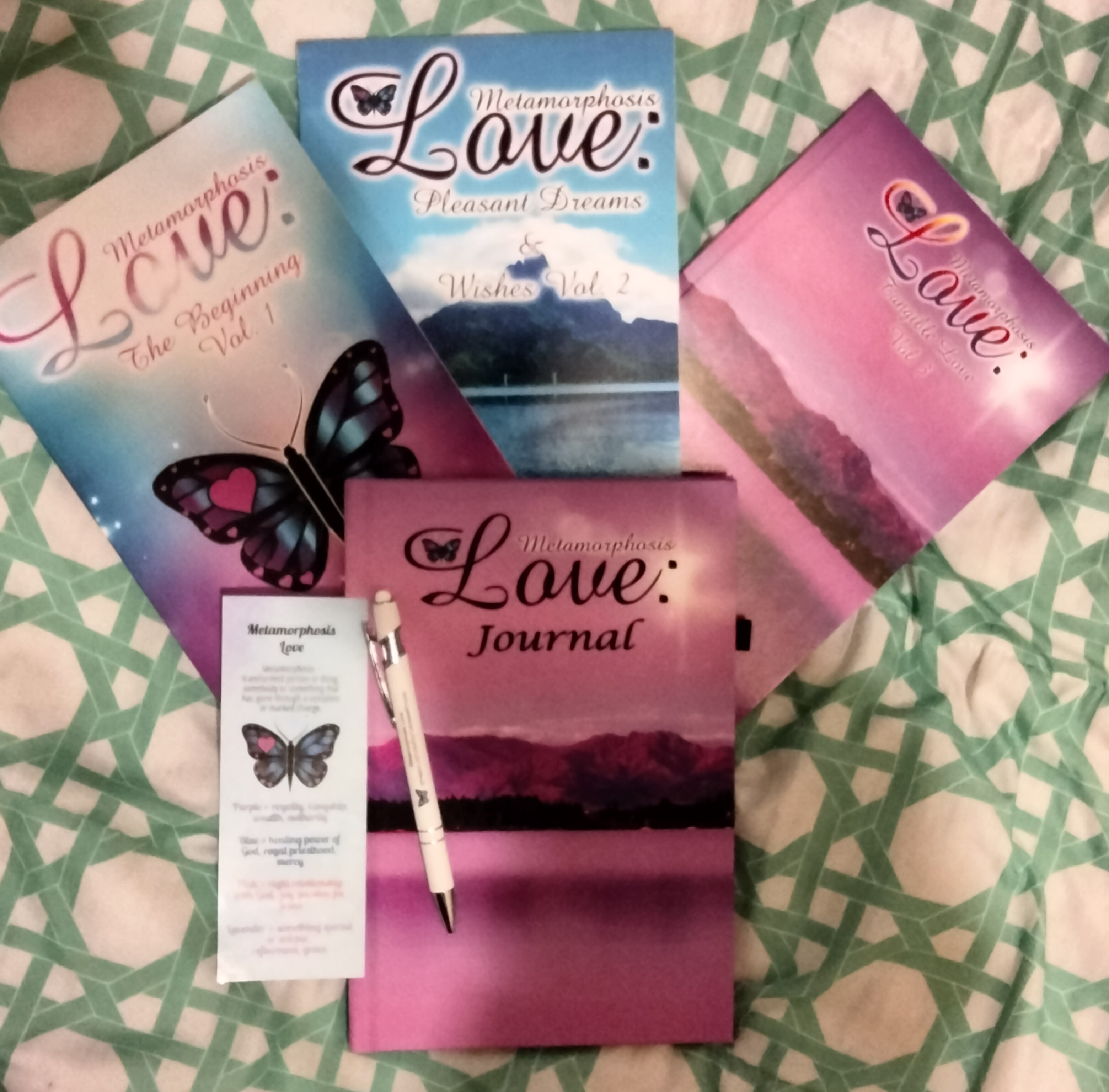 3 – Metamorphosis Love paperbacks *The Beginning Vol.1 *Pleasant Dreams & Wishes Vol. 2 *Tangible Love Vol. 3 1 – ML handmade color bookmark (color varies) 1 – ML hardcover personalized journal and stylus ink pen Autograph included. Shipping fee included.