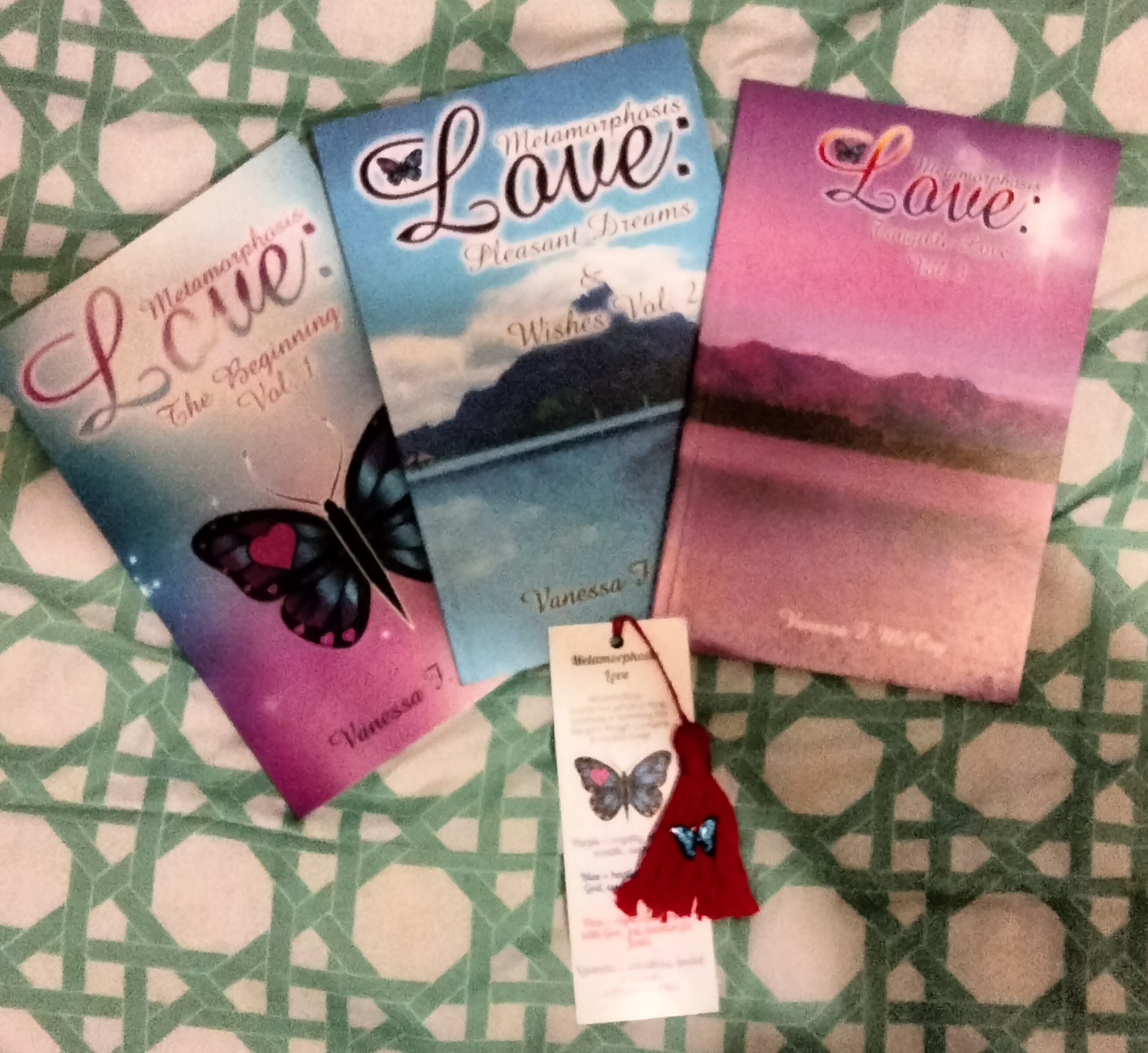 3 – Metamorphosis Love paperbacks *The Beginning Vol.1 *Pleasant Dreams & Wishes Vol. 2 *Tangible Love Vol. 3 1 – ML handmade tassel with charm bookmark (tassel and charm color varies) Autograph included. Shipping fee included.